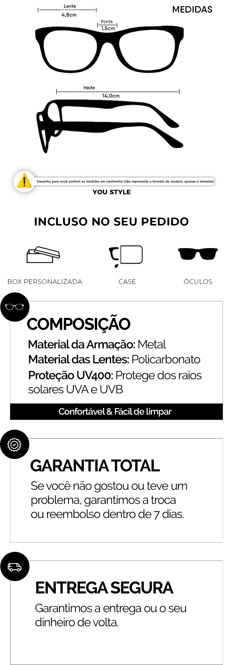 Todos os materiais empregados nos óculos YOUSTYLE são da melhor qualidade que você pode encontrar nos óculos de sol, e sentimos orgulho de poder oferecer eles a você.